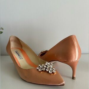 Brian Atwood salmon pink rhinestone jewelled satin kitten heels - size 39 / US 8