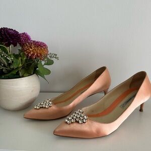 Brian Atwood salmon pink rhinestone jewelled satin kitten heels - size 39 / US 8