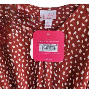 This brick red maternity dress by Isabel features a chic leopard print and is perfect for comfortable lounging or casual outings. Crafted from 100% Rayon, notable features include a unique neck design, elbow-length sleeves, and elastic ruching for an adjustable fit.