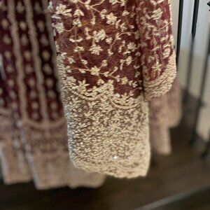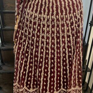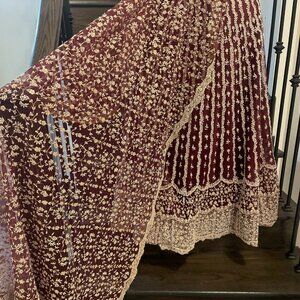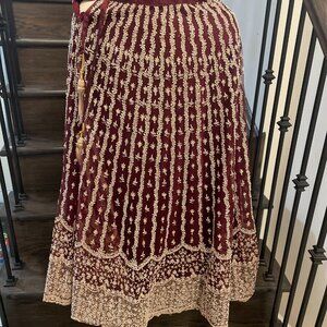Heavy, hand embroidered, burgundy wedding/bridal lengha. Never been worn before. 3 pieces - heavy matching dupatta, lengha (with satin lining), embroidered cloth for choli.