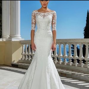 Never worn. it’s designed by Justin Alexander and shipped from the US. price is negotiable, I can also offer fabric for free with the dress.