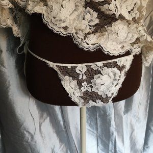 Frothy cream coloured lace camisole with cross over ties in the back and ruching at the hem. Comes with matching side tie thong.