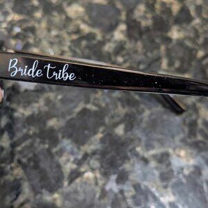 Brand new, never worn Bride Tribe Sunglasses. 7 piece set. Individually wrapped. Perfect for a Bachelorette Party! 1 pair of white glasses with "Bride" in script on the left arm. 6 pairs of black glasses with "Bride Tribe" in script on the left arm. Super Cute!! Did someone say Beach Party?!
