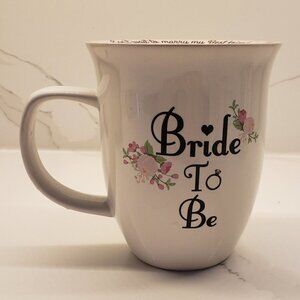 Lovely mug that expresses joy. "Bride to Be" on front and back of mug and words "Can't wait to marry my best friend" and "He popped the question and I said Yes!" printed on rim.