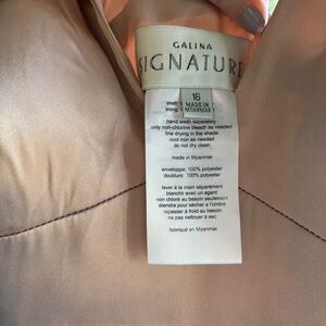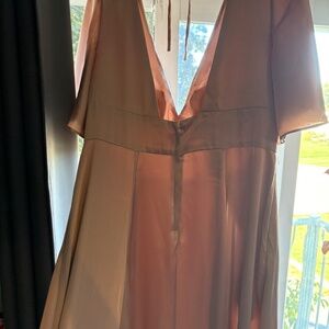 David’s Bridal dress in colour sand (rose gold colour). Worn for a wedding, cleaned and no stains will just need a steam for wrinkles! Size 16 (I am a size L in shirts and 10/12 in pants for reference). NO alterations done. Paid $275 originally.