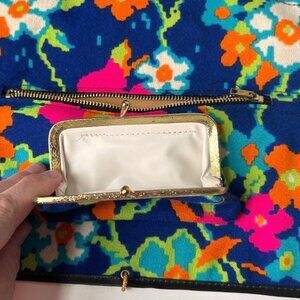 This bright (nearly neon) flower power vintage jewelry organizer/wallet is made of soft fabric and is lined. It may have been handmade by a skilled seamstress. It measures approximately 9.5 inches long and 5 inches wide when closed. Knotted string closure with two metal zippered compartments and a coin pouch.