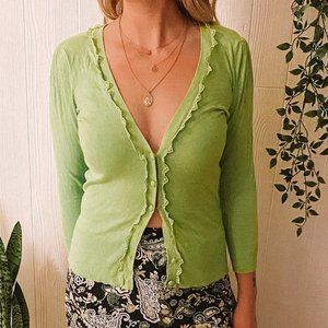 Bright green and super flattering. Has super cute frilled detail along collar.