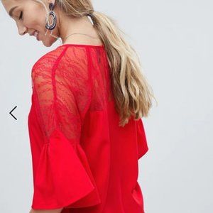 Delicate bright red blouse with lace insert. Flutter 3/4 length sleeves.