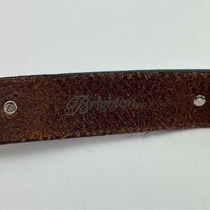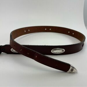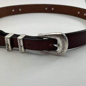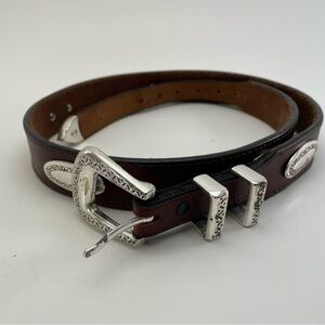 Leather belt metal embellished spread out over entire belt. Embellished metal is showing signs of tarnish.
