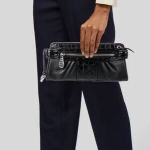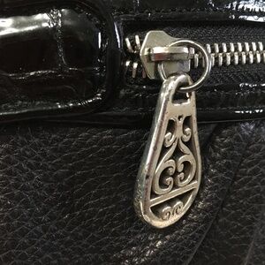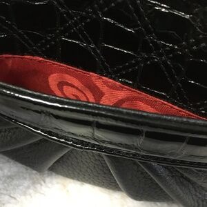 Beautiful Brighton clutch finely crafted in black pebble grain leather and accented with patent leather croc print and trim. This bag will be your new go-to for those special occasions when you need the perfect small bag to go with that little black dress. Easily holds a large smartphone, and other essentials, yet small enough to keep on the table within eyesight when dining out. Converts from a clutch to a crossbody bag with detachable chain strap (replacement, not original).