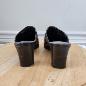 Tudor mules. Croc embossed pattern with signature buckle design.