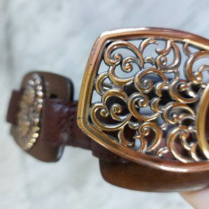 Check out this Brighton Women's Black Leather Coconut Shell Buckle Belt in very great pre-owned condition, with minor wear on the gold tone hardware buckle.