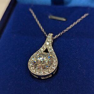 Stone has a very light blue colour set in the centre of the tear drop pendant surrounded by 24 Round Cut Cubic Zirconia in tear drop halo set.