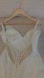 Worn once. Bustle added by a professional seamstress. Only damage is to two buttons at bottom of train as shown in picture which can easily be replaced. Not yet dry cleaned. No damaging stains, just what would be expected at the hem from walking around which should be easily removed by dry cleaning.