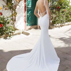 "Meet Britanny, a figure-hugging mermaid stunner featuring a daring backless, padded illusion corset style bodice with a plunging V-neck. Cut from lightweight stretch georgette for a luxurious drape, Britanny is sleek, elegant and non-traditional, for a modern minimalist bride with all the confidence.