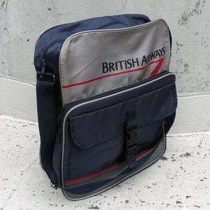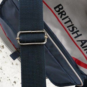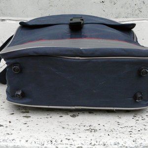 Nylon travel bag. Features adjustable shoulder strap and various compartments. No obvious signs of wear.