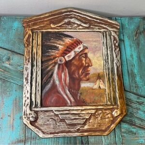 This piece is a Native American Chief oil painting painted on slate which was completed approximately in the 1940s