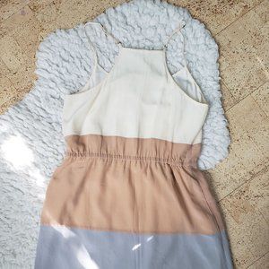Cream, taupe and dusty blue/grey spaghetti strap dress, with elastic cinched waist.