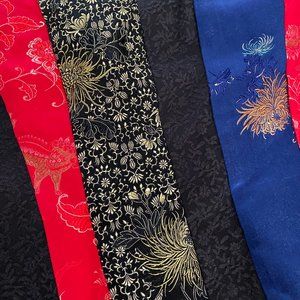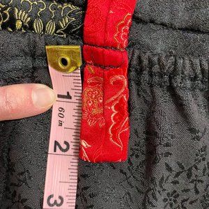 A black, red, blue, and gold multi-panel tank with golden flower brocade-like texture details.