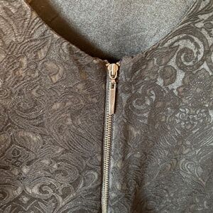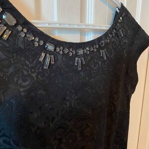 Black with a raised, subtle brocade pattern mini dress that fits above the knee. Boat neckline with jewelled with charcoal colour embellishments in the front.