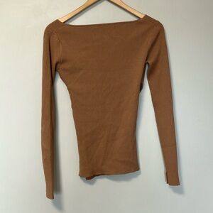 Stylish brown ribbed long sleeve top with a unique wrap design. Perfect for casual wear.