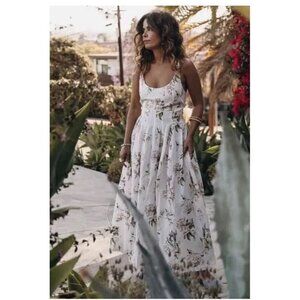 This Brock Collection X H&M Midi Dress in size 2XL features a romantic floral print in a lyocell linen blend material. The sleeveless dress has a fit & flare style with a zip closure. It is perfect for various occasions like travel, weddings, parties, or casual wear, and is adorned with a lovely flower theme, suitable for all seasons.