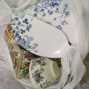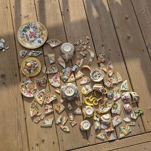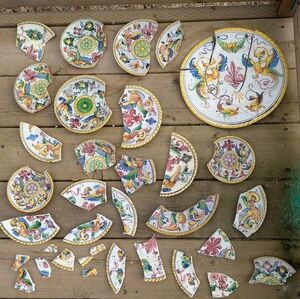 Broken dishes for crafting, most of the same pattern. They were my Grandmother's, we set them out on a table to look at them and the drop leaf dropped. Now they are as is. 0.5 kg per $15. Classic European Mid Century Modern dishes for North American tourists. My Grandmother loved to travel Europe in her day, the Mediterranean was her favorite. I remember these in her house. Italian majolica.