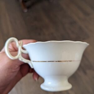 Some broken and cracked tea cups and matching saucers from the mid 1800's "George Frederick Bowers (& Co)" brand. They are really pretty with gold flowers and leaves. My Grandmother gave them to me decades ago (they were in this condition when I got them), I assume they belonged to her mother.