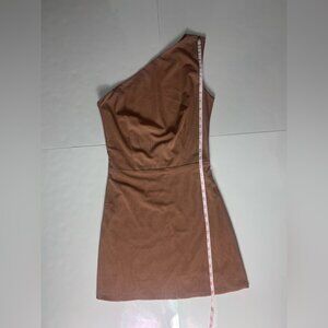 Chic Bronx and Banco beige one-shoulder mini dress in size 8. Made from a durable polyester blend, this dress features a sleeveless design and asymmetrical neckline, with sheer material for an alluring touch. Its neutral hue makes it versatile for both casual and evening events.