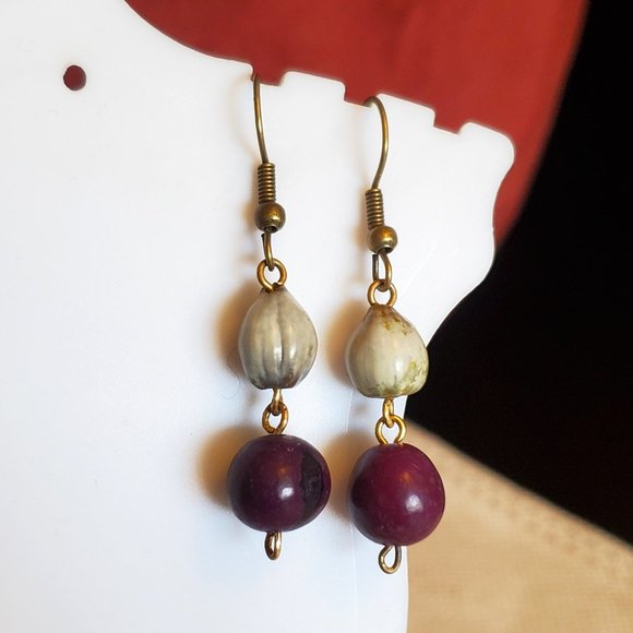 Bronze Hook Natural Seed Bead Dangle Earrings NWT, Purple and Grey Seeds