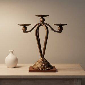 Bronze Iron 3-Arm Candelabra Antiqued Design Ornate Base Candleholder Medieval