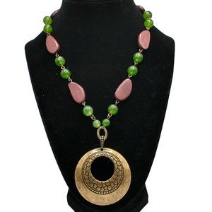 Bronze Tone Medallion Necklace with Wood and Green Beads Boho Necklace