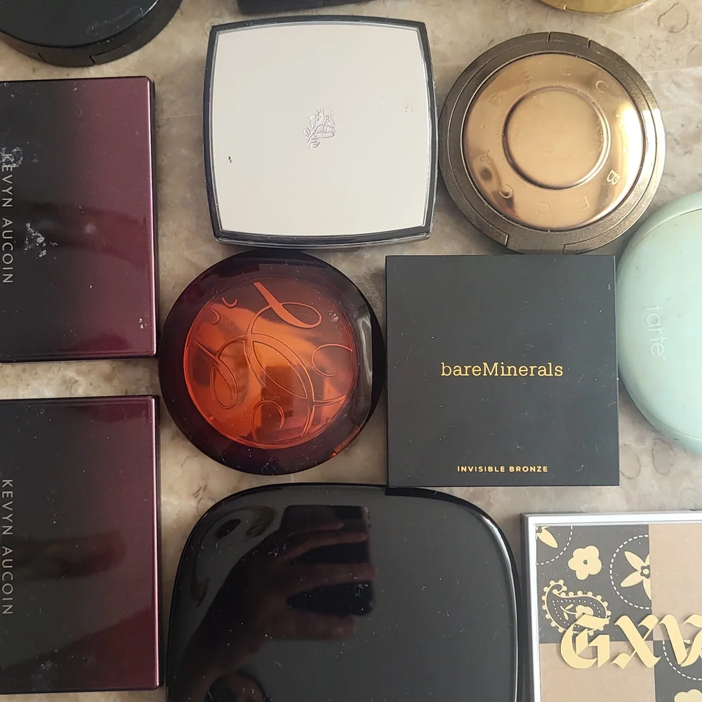 Diverse collection of makeup compacts featuring brands like Kevyn Aucoin, bareMinerals, and Tarte. Includes shades of black, brown, and gold.