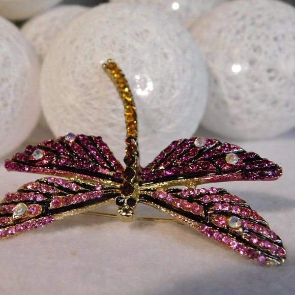 Gold tone brooch Pink rhinestones with Amber tail and black enamel accents