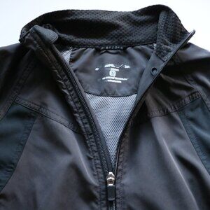 Lightweight Shelter Technology active gorpcore collared full zip cinch cord inner media pocket elasticized cuff black zip up closure