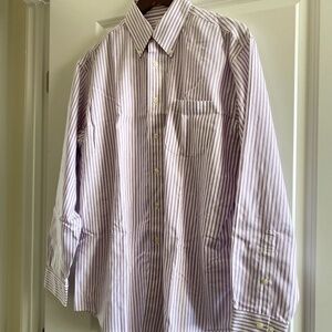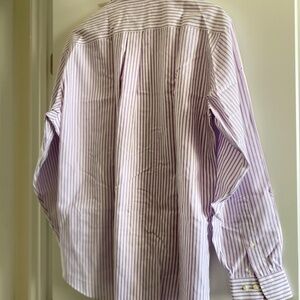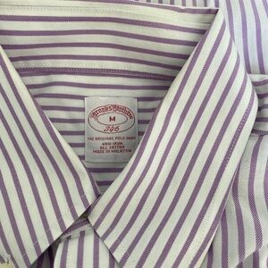 Brooks Brothers 346 Original Polo Shirt, Size M, non-iron, all cotton, long sleeve with pleated cuff, mauve & white pin stripe. Gently used in excellent condition, no rips or tears, 1 chest pocket & pleated in back. Measures approximately: body 34" long & 24"W with a 25" sleeve length & extra buttons.