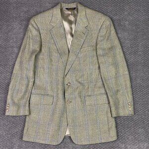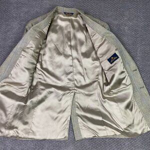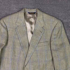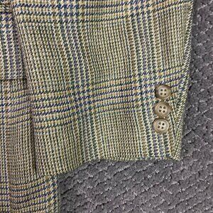 Stylish plaid blazer with a refined look. Features a blend of blue and tan. Ideal for formal and casual settings.