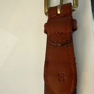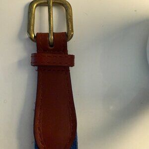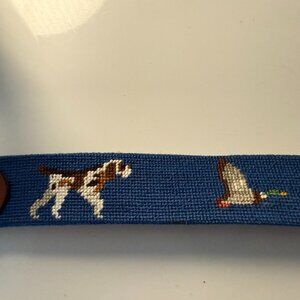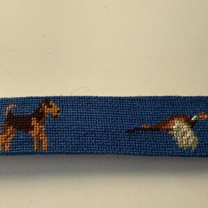 The Brooks Brothers Leather Belt is a unique accessory that combines classic style with a whimsical touch. The belt features a beautiful needledpoint design of dogs on canvas, adding a playful and artistic flair to any outfit. Made from leather and canvas, this belt is both durable and stylish, with a brass buckle for added sophistication.