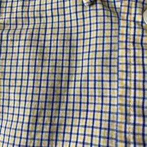 Brooks Brothers long sleeve non-iron Egyptian cotton blue & yellow plaid button-down shirt size M. Gently used, in excellent condition, no rips or tears. Long sleeves with cuff & extra buttons & pleat in back. Measures approximately: body length 32" & 23"W, 32 1/2" sleeve length.