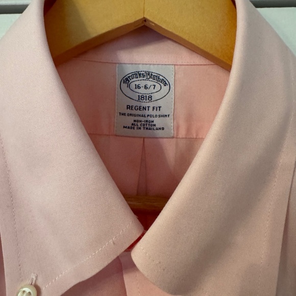 Selling a brand-new Brooks Brothers Regent Fit dress shirt, size 16 6/7, in a stylish salmon color. Although it no longer has the tags, it has never been worn. The Regent Fit offers a tailored look without being too slim, perfect for a polished and professional appearance. Ideal for both formal and business casual occasions, this shirt combines classic design with modern comfort.