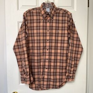 Classic and refined, this Brooks Brothers Regent Fit button-down shirt offers timeless style with a modern touch. Made in the USA from imported fabric, this shirt features a peach, brown, and grey plaid pattern with a button-down collar, long sleeves, and embroidered Golden Fleece logo on the chest. Crafted from 100% cotton, it offers breathable comfort and polished appeal—perfect for business casual days or weekend outings.