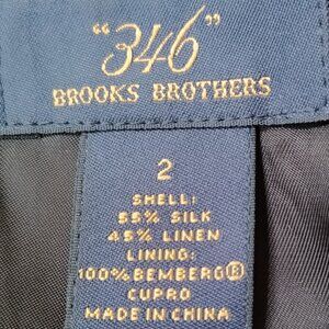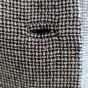 Beautiful jacket with Jackie-O 60's vibe is full of quality details. Semi-fitted with a rounded collar that frames the collarbone and face. The fabric is gorgeous - the 55% silk / 45% linen in the slubby black and white tweed feels luxurious, drapes beautifully, looks expensive. The buttonholes are all bound in self-fabric making them almost invisible. The branded Brooks Brothers shiny black buttons complement the fabric, have a curved surface with an inset shank. Welt pockets with flap and working button are stylish and practical. The sleeve hems have a 1 1/2 inch slit. The front hem is longer than the back with a feminine, curved shape. The lining is top-quality Cupro Bemberg fabric with a small interior welk pocket just below the waist.