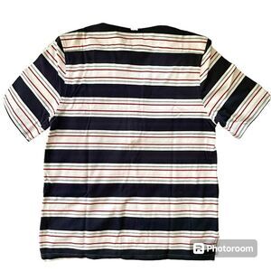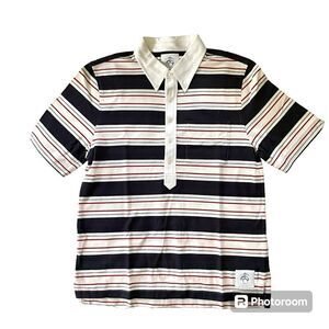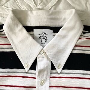 Brooks. Brothers short sleeve striped polo. Button down collar, side slits, 5 buttons, front left chest pocket. This a thicker fabric, I believe cotton, but no content tag attached.