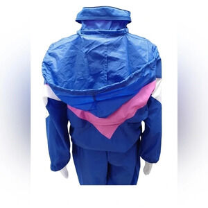 Y2K, Blast from the past! Purple with pink and white this 2 pc matching windbreaker set has a hidden hood, two flat pockets and a drawstring waist on the jacket.