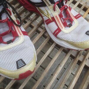 Brooks Racer ST 4 Red Black White and Gold Running Shoes Size 9 Men's. The size label is faded but you can still make out with a magnifying glass that it is marked a size 9.5 but it tends to fit much closer to a true 9. In excellent condition with no damages. There is general wear but nothing extreme. Clean, stain and odor free.