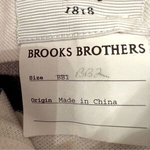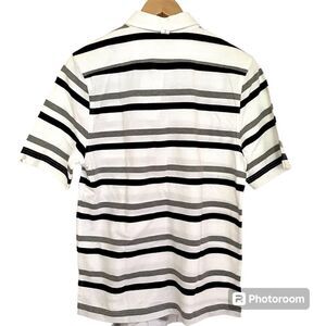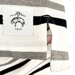 Brooks. Brothers short sleeve striped polo. Button down collar, side slits, 5 buttons, front left chest pocket. This a thicker fabric, I believe cotton, but no content tag attached.