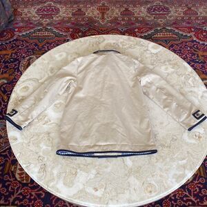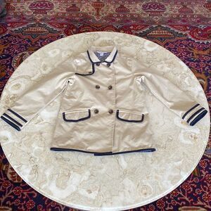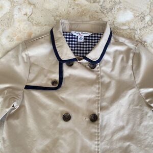 In excellent preowned condition with no stains or flaws, gorgeous classic Brooks Brothers double breasted trench coat in elegant tan fabric with navy blue edging details. Flap pockets, fully lined. A classy little coat for your princess!