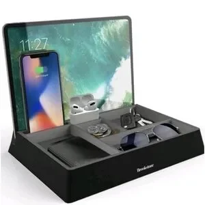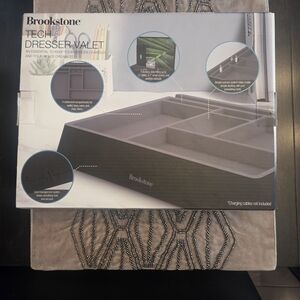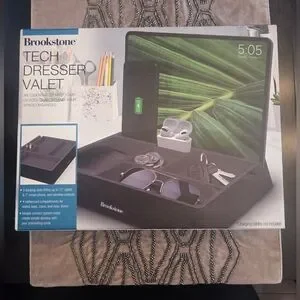 Neatly store smartphones, tablets, ear buds, as well as eyeglasses, keys, coins and other belongings in this Brookstone Tech Dresser Valet. Features 3 docking slots and 4 rubberized compartments to meet your storage needs. The cord management system allows for simple docking using the cords from each device.
