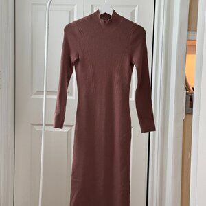 Midi length (hits mid-calf) in size Medium Tall from Abercrombie & Fitch. Worn twice and in excellent condition. This elegant sweater dress is a beautiful mocha brown with a mock neck collar and an open back for a playful twist. This back is high enough to avoid interference with undergarments.
