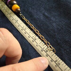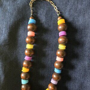 Offering a brown beaded necklace with a colourful pattern! The beads are made of wood, and the colourful pieces are made of plastic.
